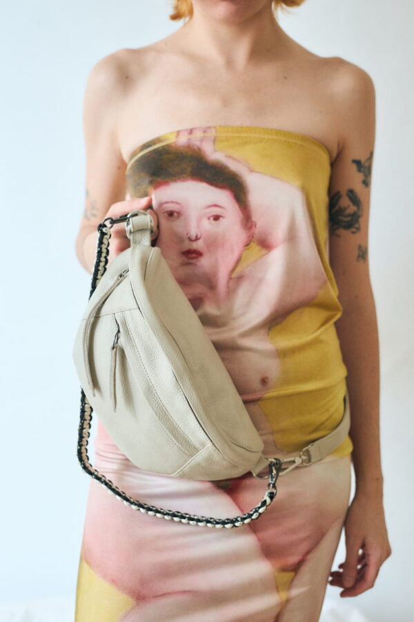 Crafted in soft leather with an adjustable strap for maximum comfort. Front, back, and interior pockets for impeccable organization. Cotton lining with Shipibo print. Handwoven adornment, removable for personalized style. Lightweight and functional for your daily adventures!