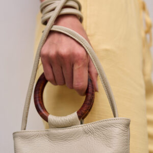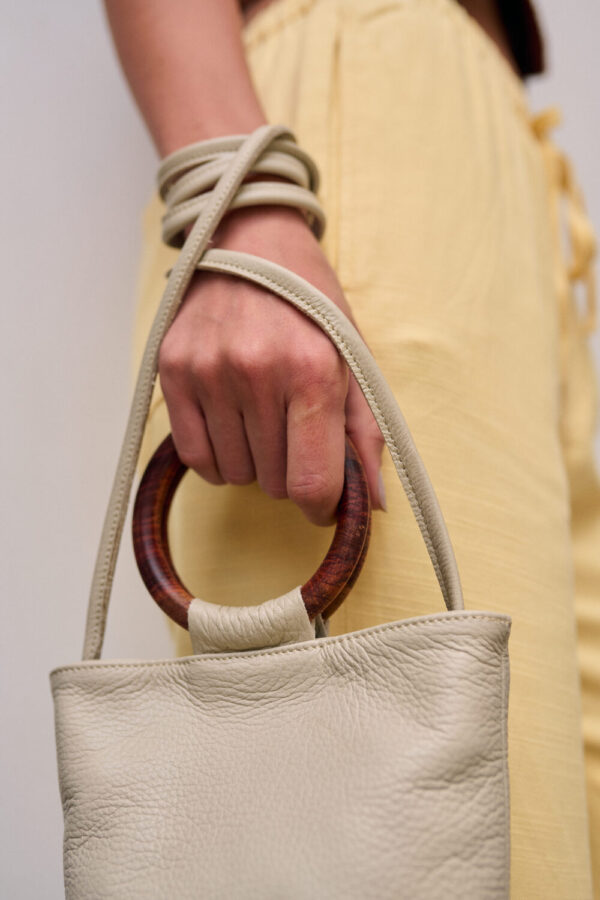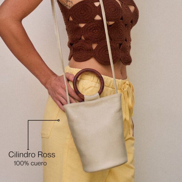 Large-capacity leather cylinder, with cotton lining printed with Shipibo Konibo design and internal zippered pocket. It has a wooden handle for carrying it by hand and an adjustable strap for wearing it over the shoulder or across the body. Style and functionality in one!