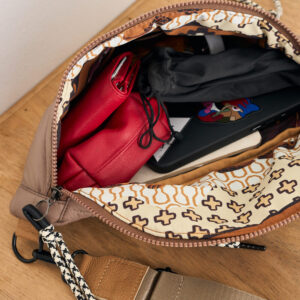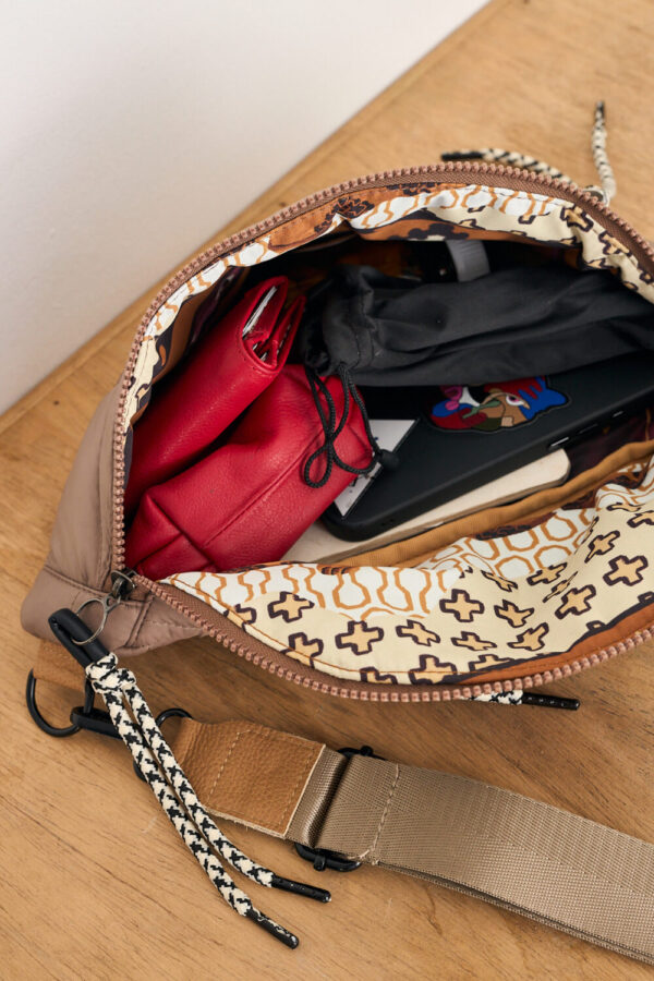 Puffer Fanny pack with an illustrated lining in tribute to the Peruvian Amazon for a unique touch. Practical and modern. Features a secure back pocket and internal compartments. Details in leather and durable padded fabric. Perfect for daily outings or weekend getaways