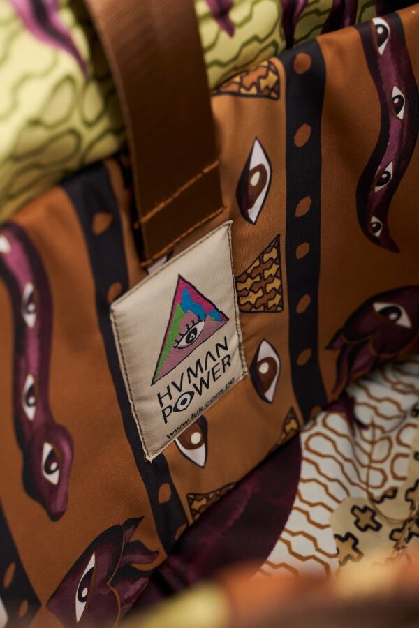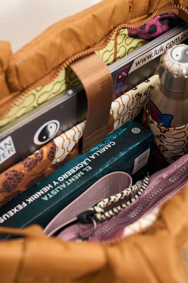 Tote made of padded fabric known as Puffer, with an illustrated lining in tribute to the Peruvian Amazon for a unique touch. Combines fashion and practicality. Features a pocket for a thermos, secure compartment for a 16" laptop, organizer pockets, carry-on divider, and premium details. The perfect bag for travel or everyday use! Built to hold all your essentials.