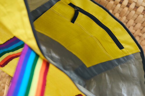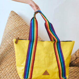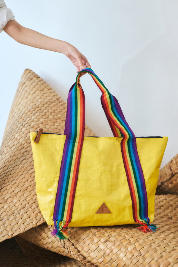 Style and functionality in one. Made with waterproof material and woven cotton handles, inspired by the Peruvian sailor's sash. With an interior pocket and elegant logo details and leather puller.