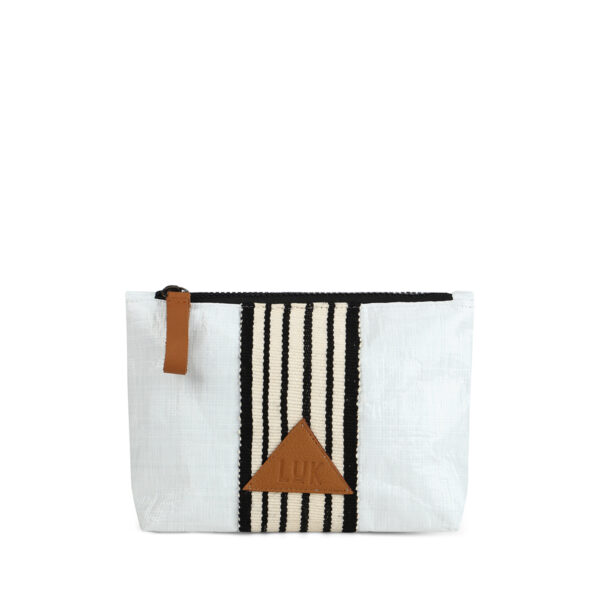Compact and waterproof, this toiletry bag features unique details like the logo and puller in leather, along with the cotton weave reflecting the Peruvian northern marinera fajín.