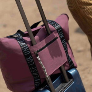 Spacious bag made of anti-fluid fabric. It has a zippered pocket inside and an external zippered pocket.