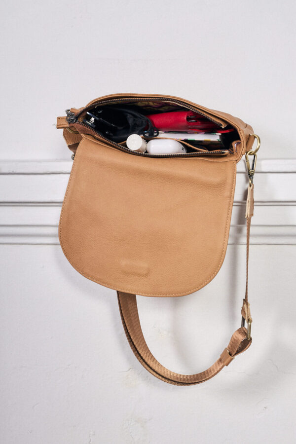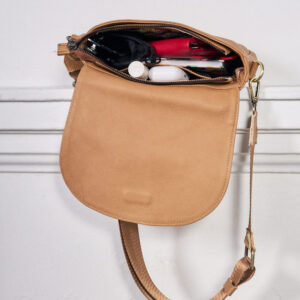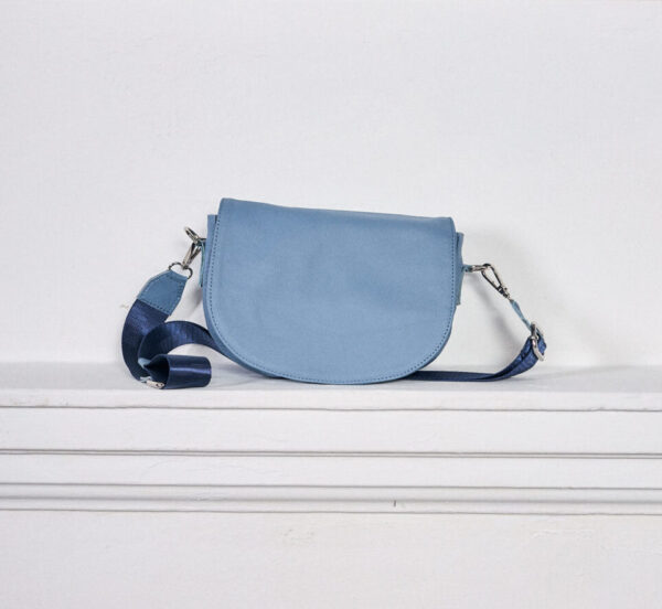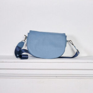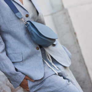 Bandolera azul de cuero, compacta pero espaciosa. Ideal para celular, billetera y llaves. ¡Estilo bohemio con identidad peruana!