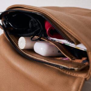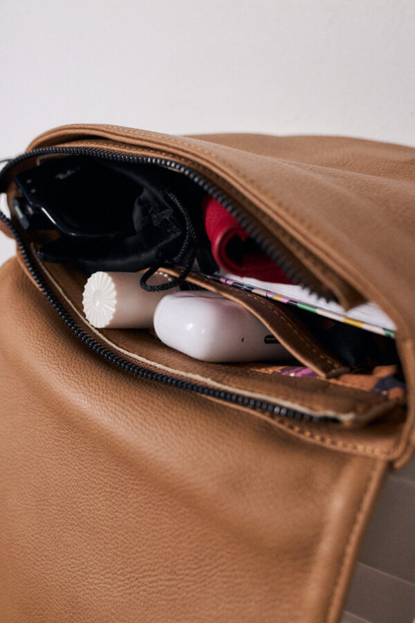 Bandolera en Miel, diseño artesanal y práctico. Con bolsillo interno seguro y un forro interior Ilustrada en homenaje a la Amazonía peruana para un toque único. ¡Complemento perfecto para looks étnicos o urbanos!