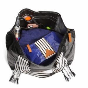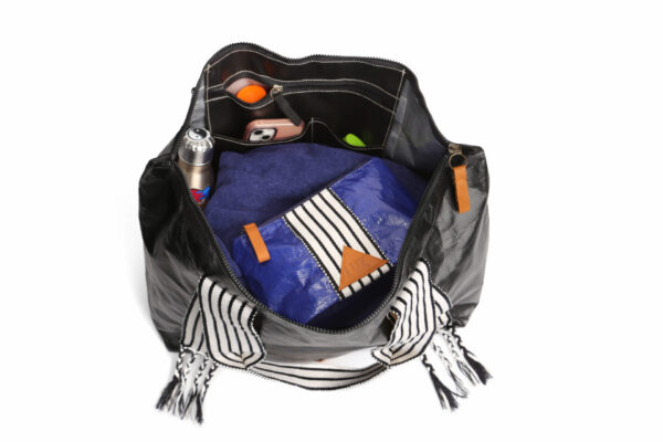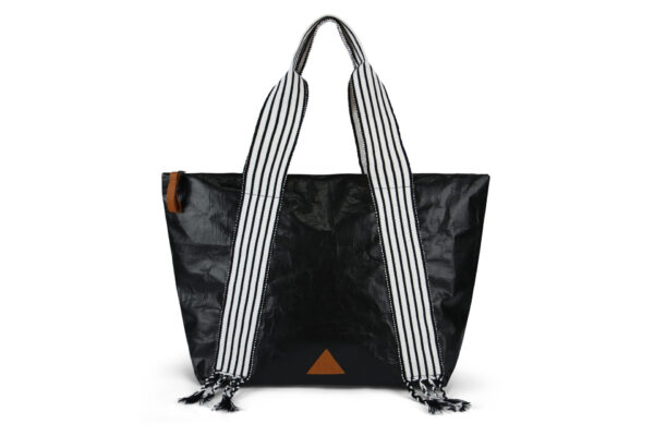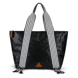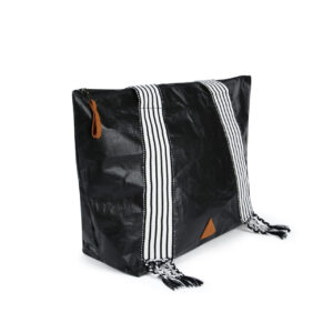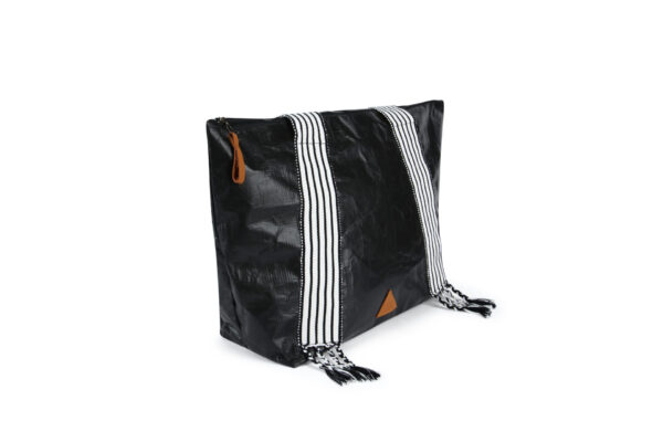 Estilo y funcionalidad en uno solo. Fabricado con material impermeable y asas tejidas en algodón, inspiradas en el fajín de la marinera norteña peruana. Con bolsillo interior y detalles elegantes de logo y jalador en cuero.