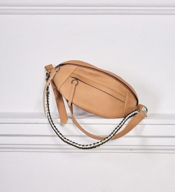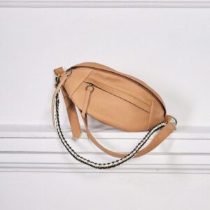 Confeccionado en suave cuero y asa ajustable para máxima comodidad. Bolsillo frontal, trasero e interior para una organización impecable. Forro de algodón con estampado shipibo. Adorno tejido a mano, removible para un estilo personalizado. ¡Ligero y funcional para tus aventuras diarias!