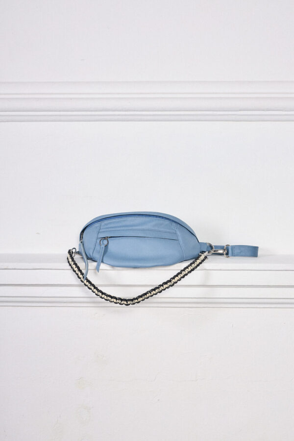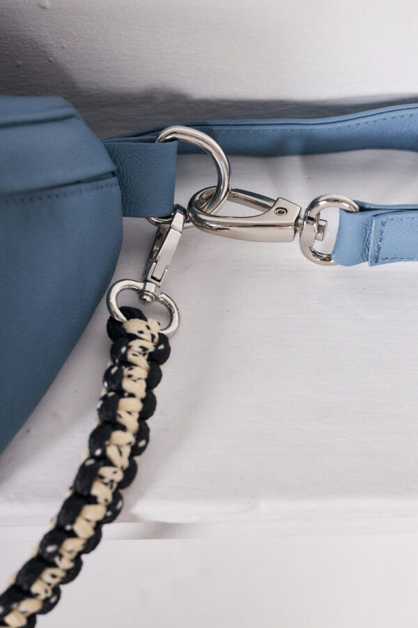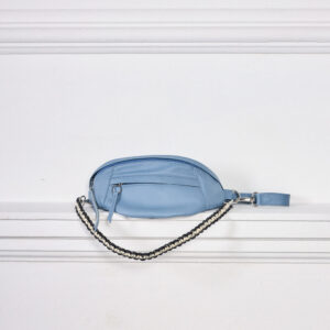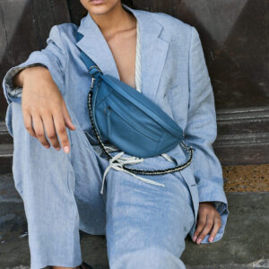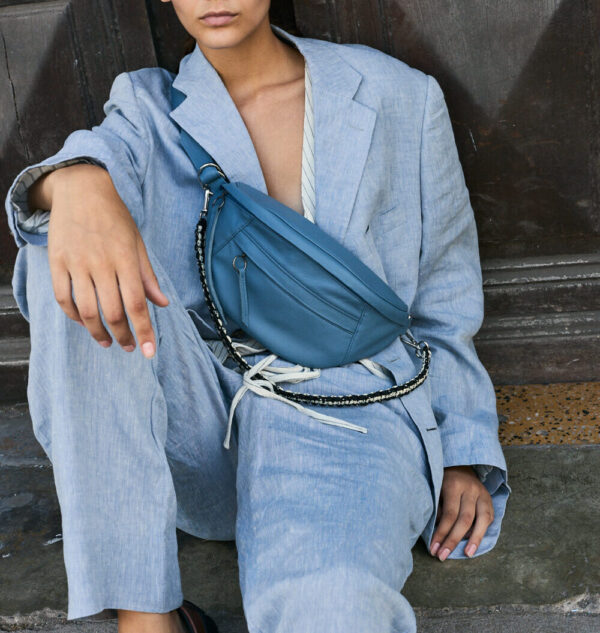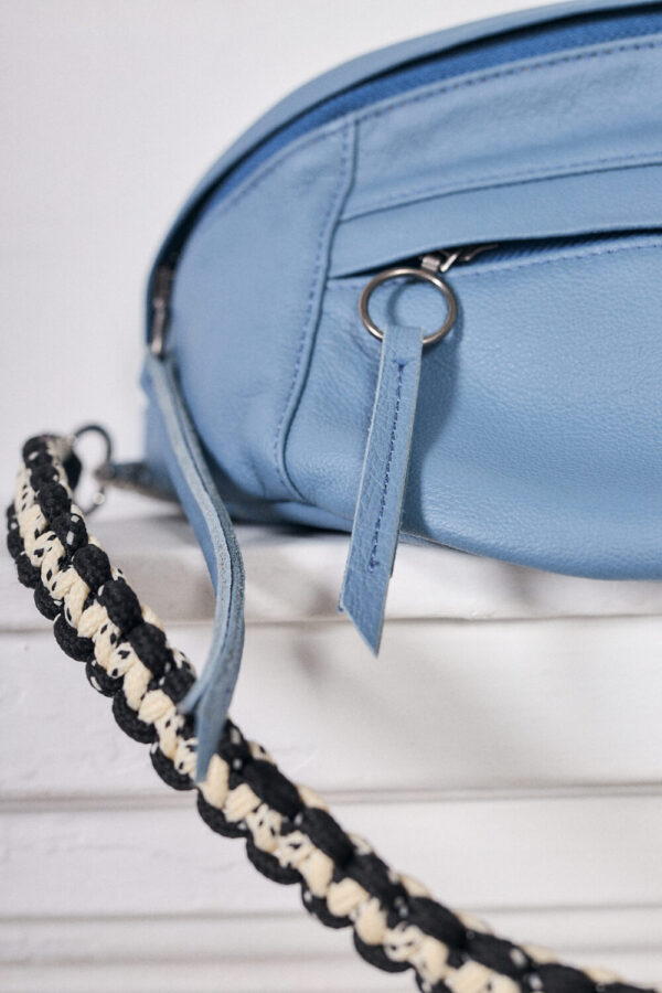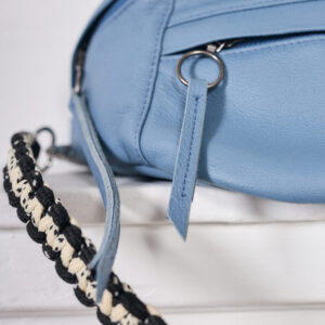 Canguro de cuero en Azul, diseño premium con asa ajustable. Perfecto para profesionales o estudiantes. ¡Ligero, organizado y con un toque artesanal peruano!