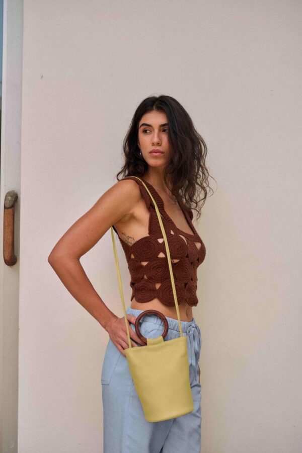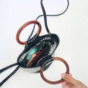 Cilindro de gran capacidad en cuero, con forro interior de algodón estampado con diseño Shipibo Konibo y bolsillo interno con cierre. Cuenta con asa de madera para llevarlo en mano y asa regulable para usarla al hombro o cruzada. ¡Estilo y funcionalidad en uno solo!