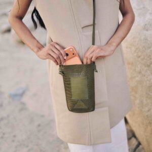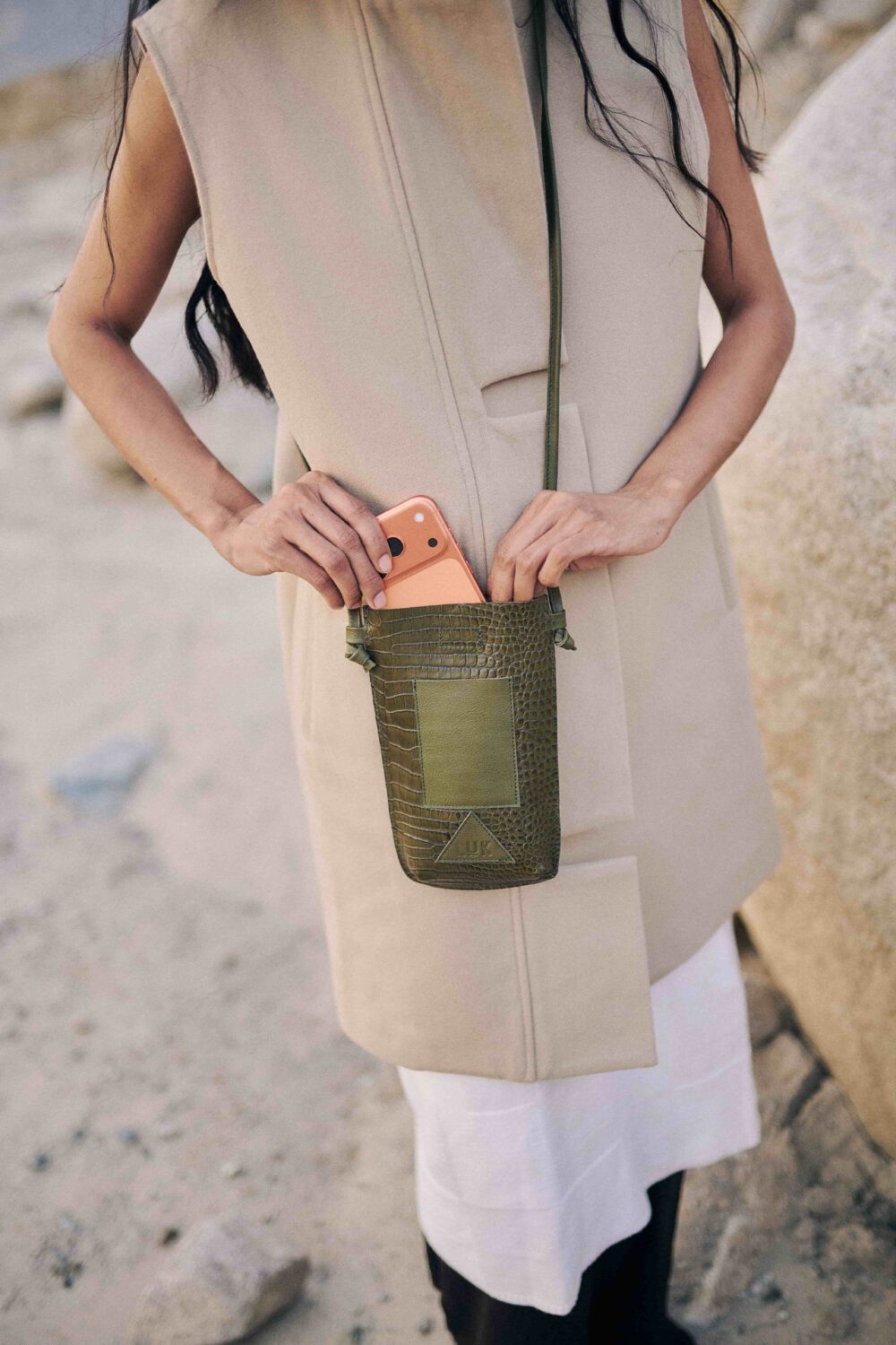 Portacelular elegante en cuero suave, con cierre magnético para mayor seguridad. Práctico bolsillo exterior para fácil acceso. Asa ajustable y extraíble para llevarlo como prefieras.