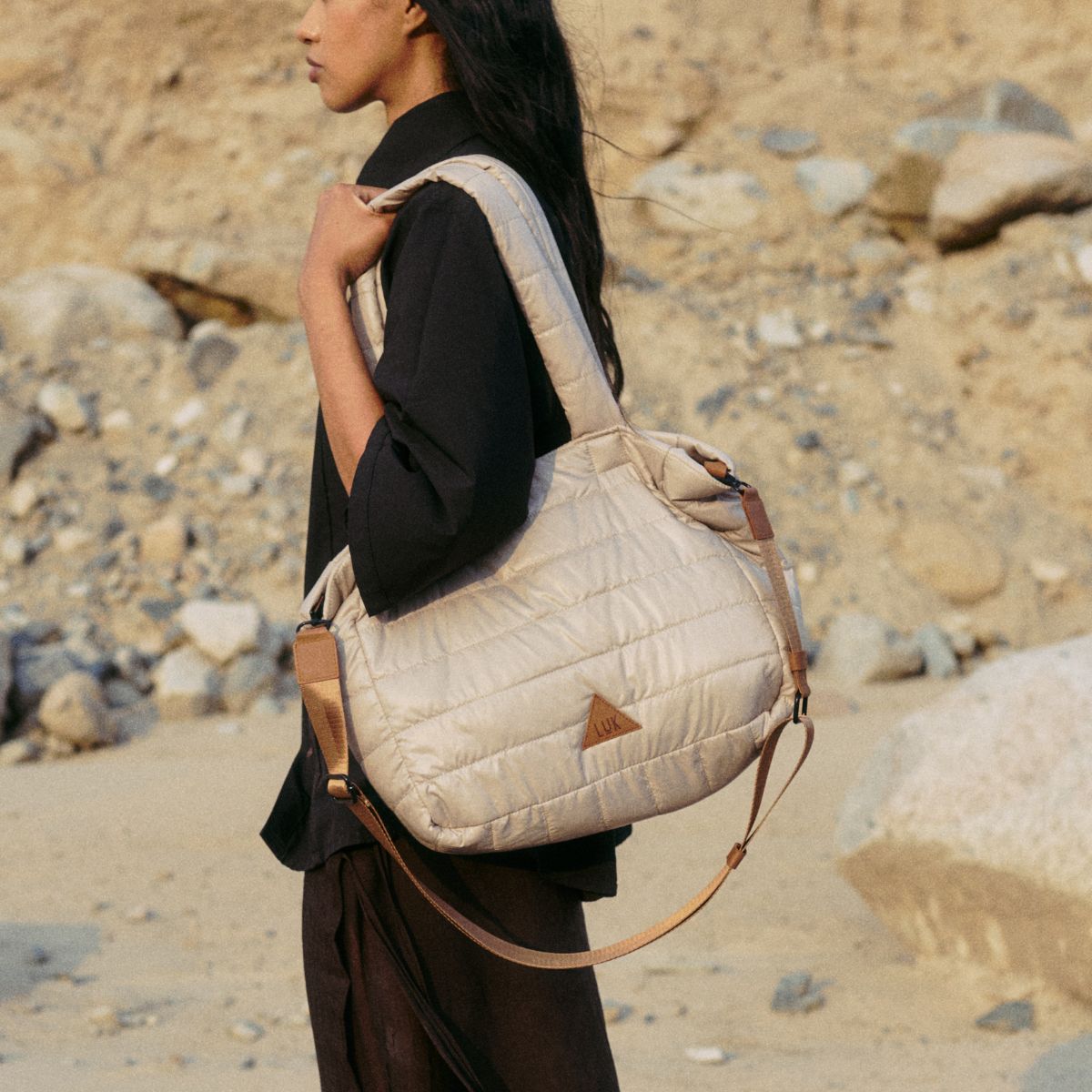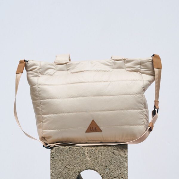 Tote de tela acolchada Puffer, con forro interior para mayor protección. Moderna y funcional, cuenta con bolsillo para termo, compartimento para laptop de hasta 16”, organizadores internos y división para carry-on. Incluye dos asas: una fija y otra regulable para mayor comodidad. Ideal para el día a día o viajes. Resistente, práctica y con estilo
